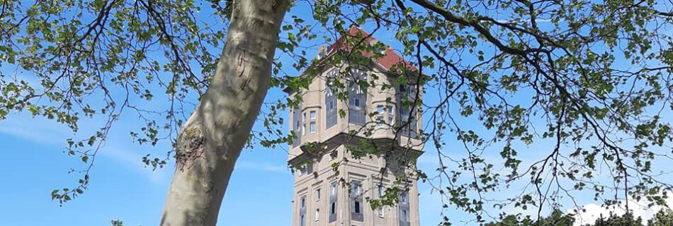 Op een vierkant grondplan opgetrokken watertoren. De torenschacht bestond uit een gewapend betonskelet van twaalf buitenkolommen en vier binnen kolommen, onderling op vijf niveaus verbonden door vloeren en koppelbalken. Deze constructie was gedeeltelijk in het zicht gelaten en gedeeltelijk bekleed met decoratief stucwerk. De openingen tussen de constructie waren voorzien van gecementeerd baksteenmetselwerk, dat aan …